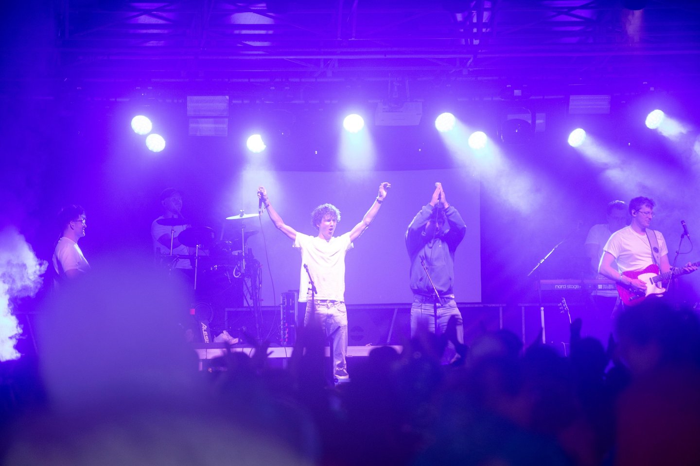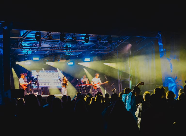 Een scherm aan de voeten van de zangers voor de liedjesteksten